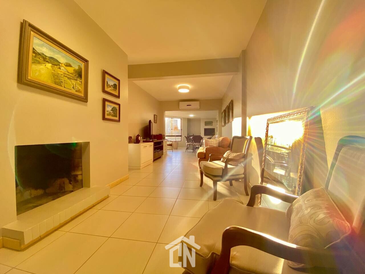 Distribuição: Sala de estar com lareira e churrasqueira, sala de jantar, 4 dormitórios sendo 1 suíte + dependência de empregada, cozinha com móveis planejados, 2 banheiros sociais, 1 lavabo e 1 vaga coberta de garagem.