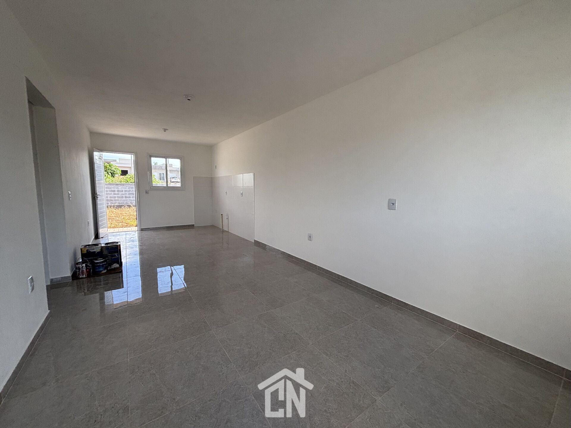 Distribuição: 02 dormitórios, banheiro social, sala de estar e jantar integradas à cozinha, esperas para área de serviço na parte externa, e vaga para 01 carro.