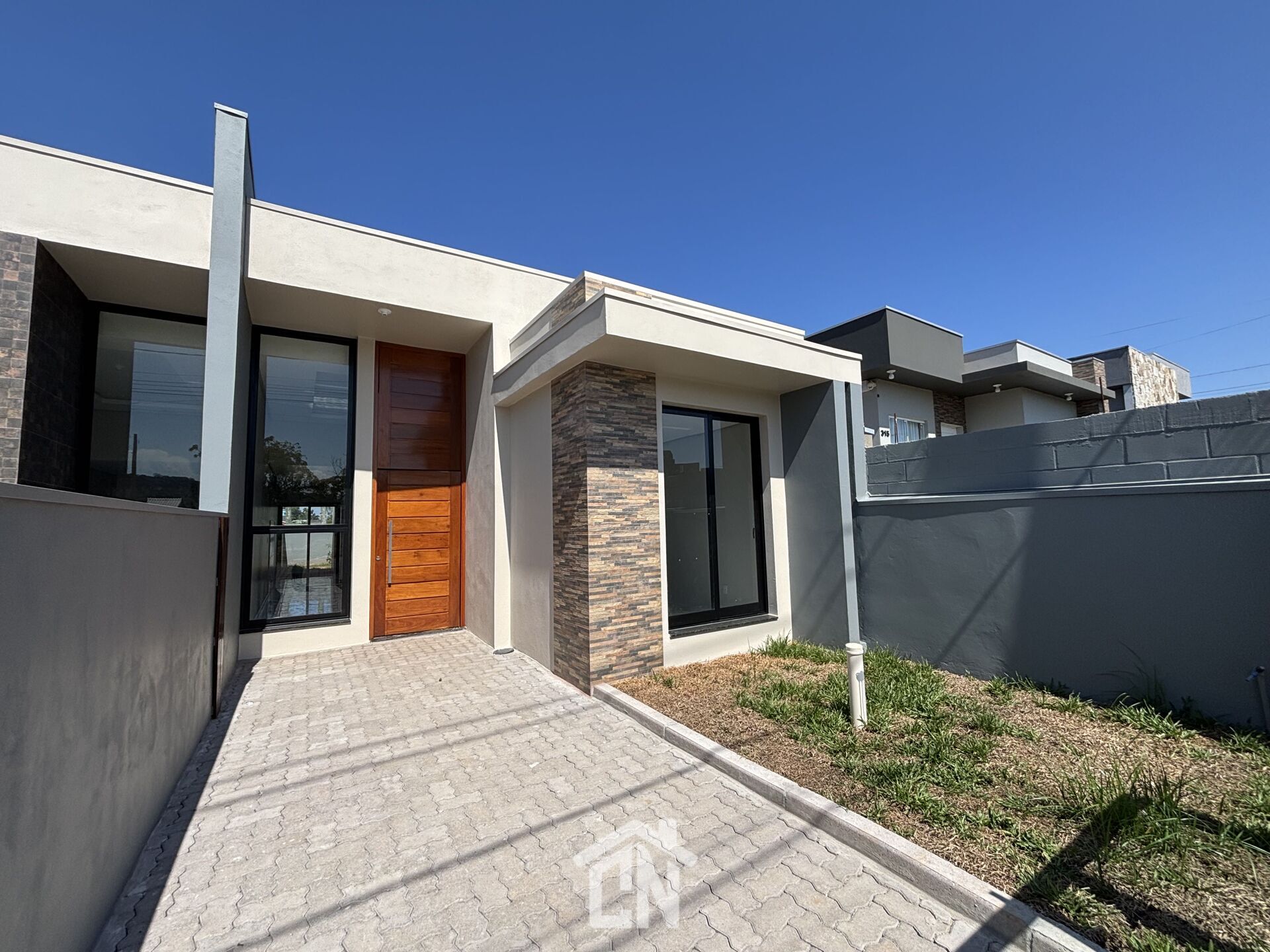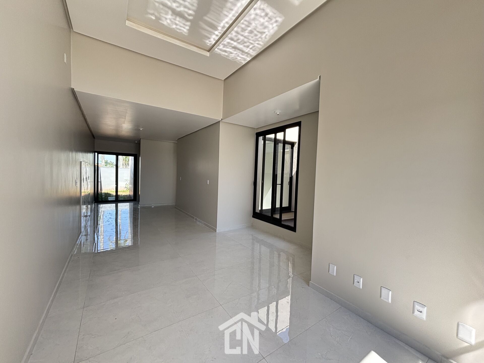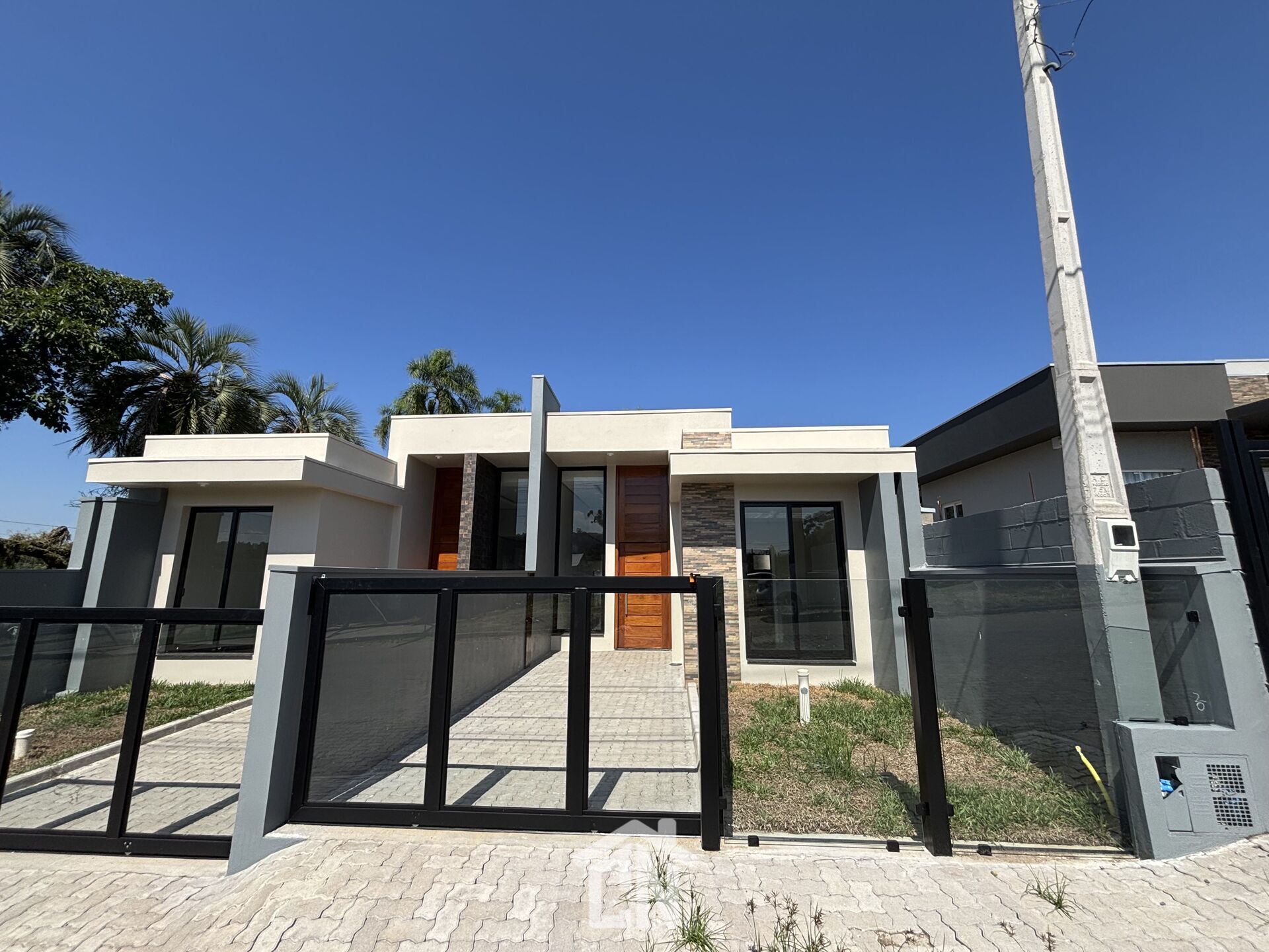 Casa toda em laje, com rebaixamento em gesso, pé direito alto, paredes com massa corrida, piso porcelanato, esquadrias em externas em alumínio preto, pátio fechado com vidro 8mm, calçada e entrada de carro em PVS.