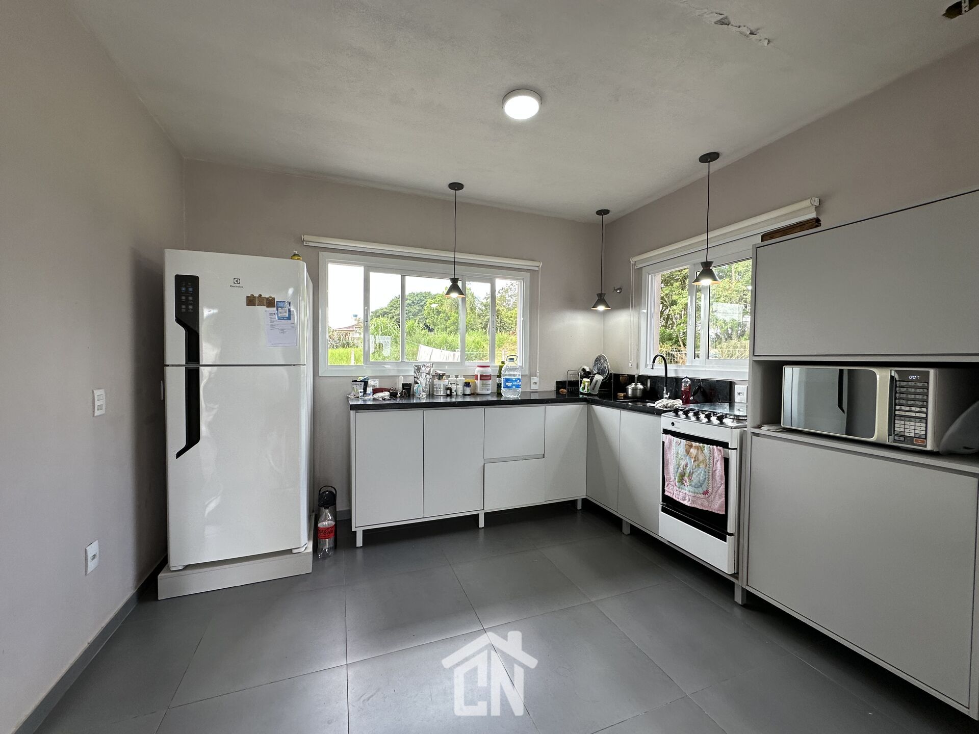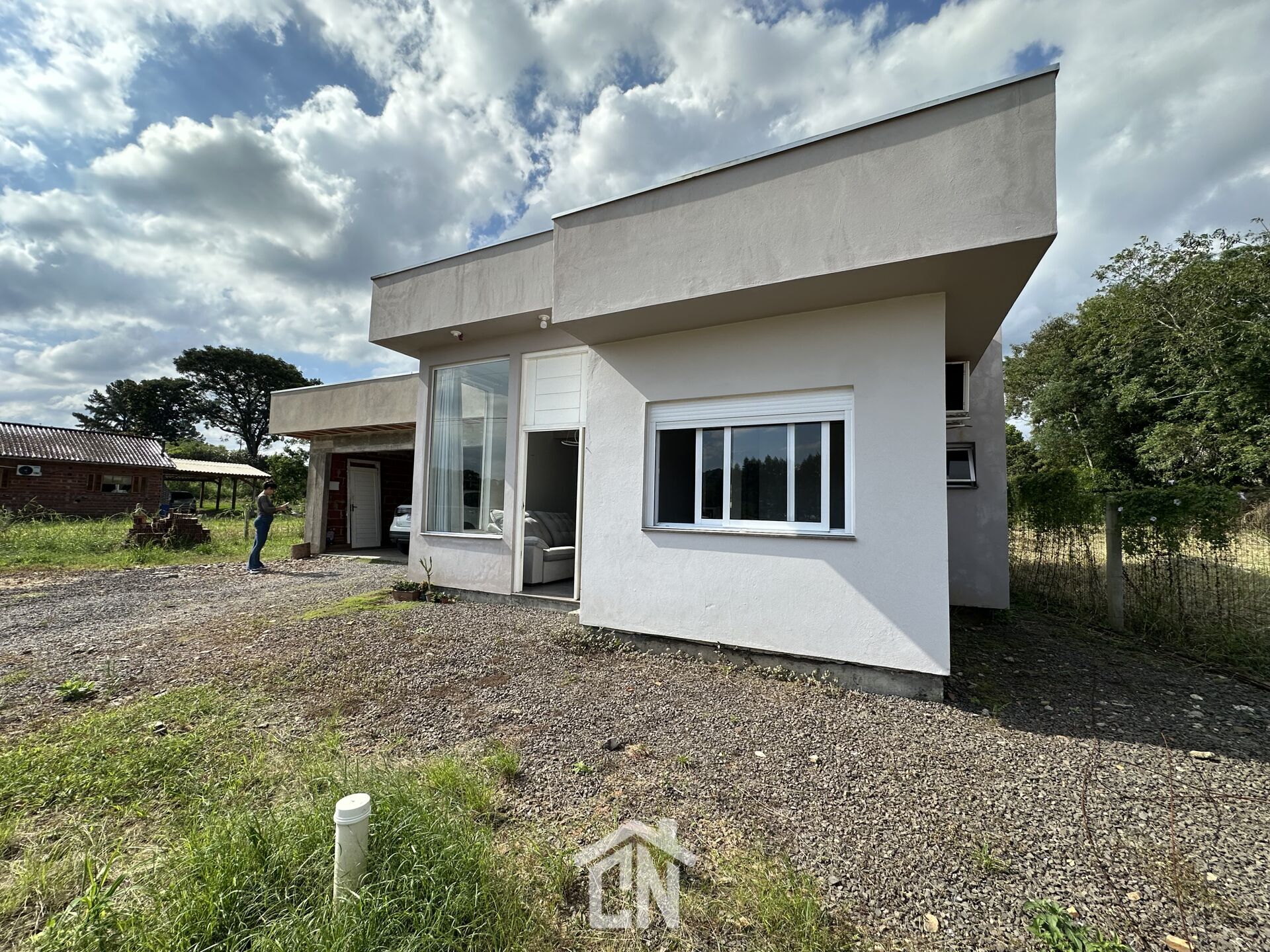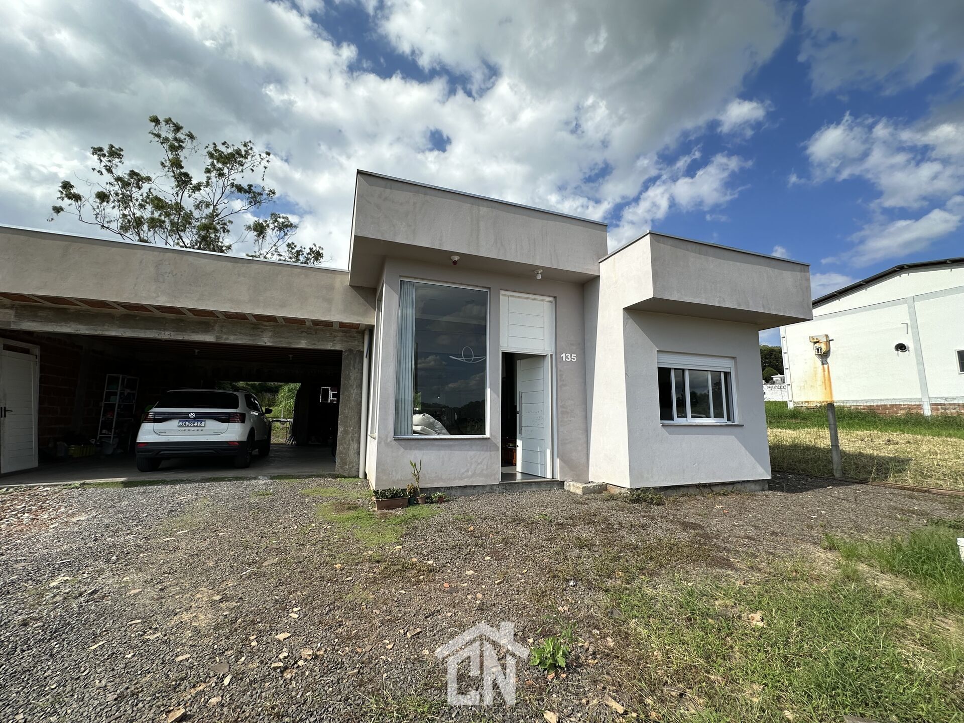 Sala e cozinha integrados, 2 dormitórios, banheiro social, garagem coberta para 2 carros, lavanderia.