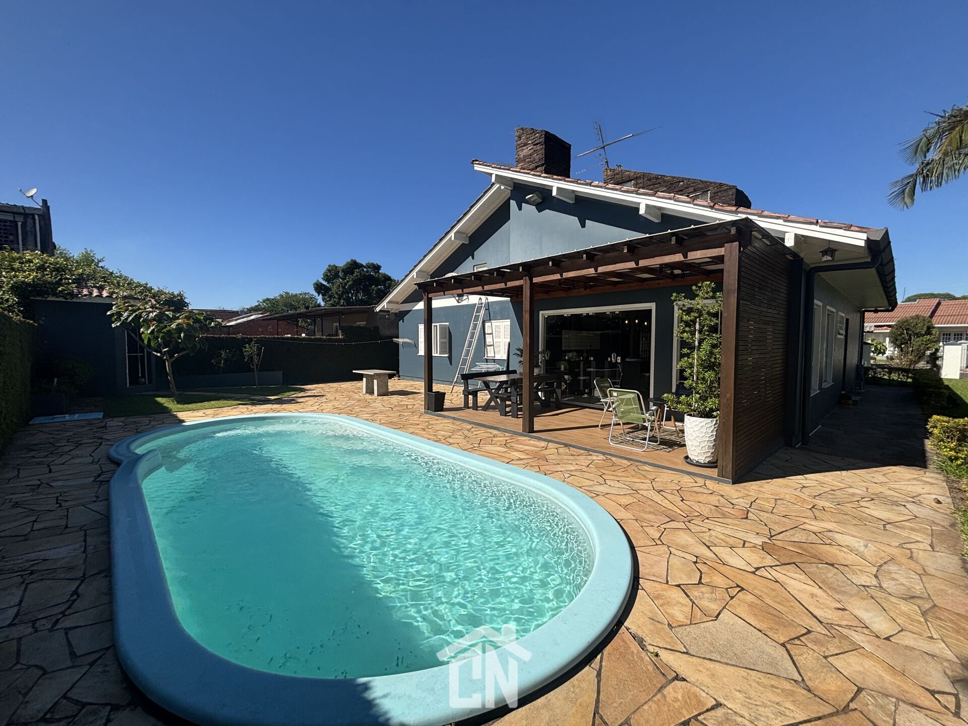 A piscina convida ao descanso e o pátio arborizado completa o clima de refúgio particular.
