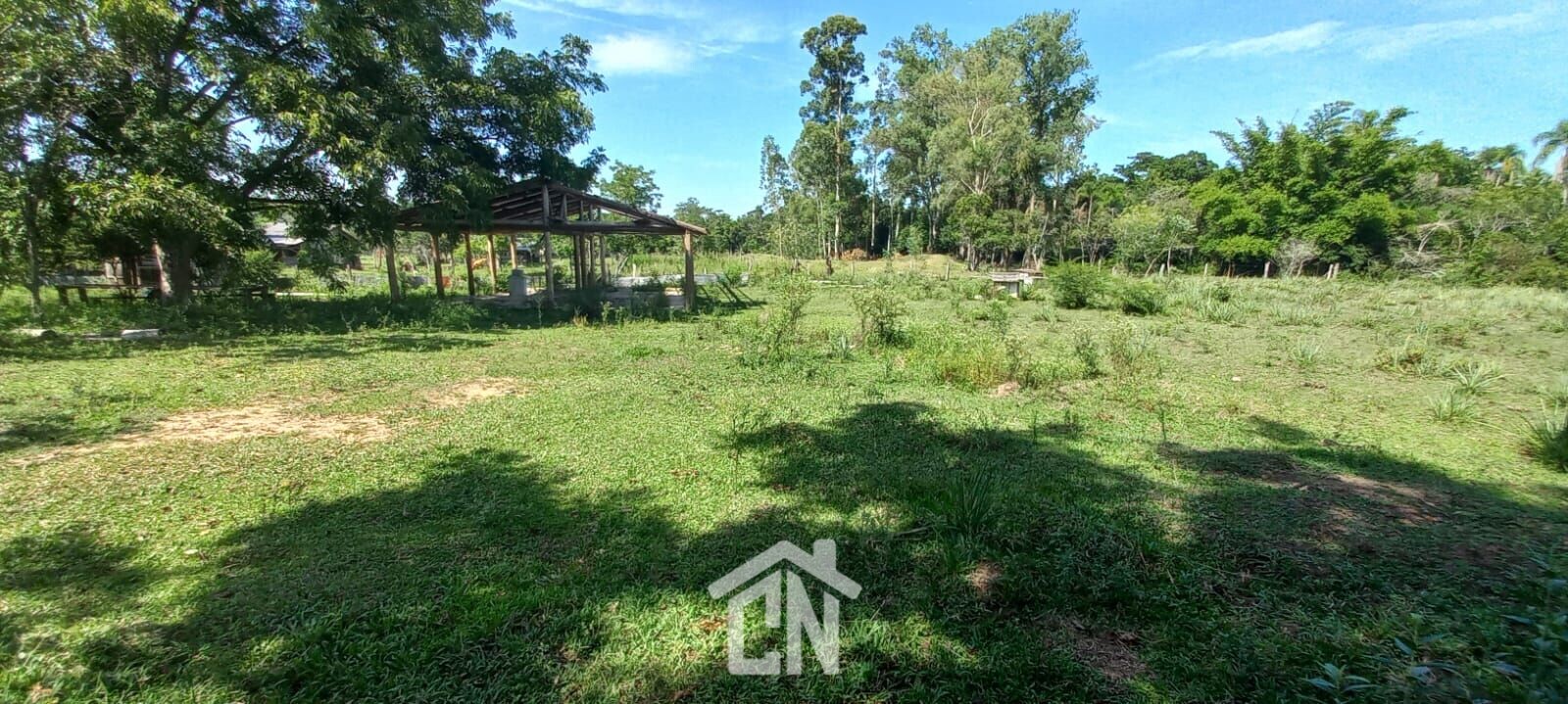 Local calmo, com área verde nos fundos, açude na parte central, galpão de madeira iniciado, falta cobertura, mas com piso finalizado.